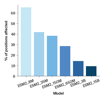 import matplotlib.pyplot as pltimport numpy as npaa_changes = []for model in ModelName: df = pairwise_data[model] df["matches"] = df["most_probable_i_i"] != df["most_probable_i_ij"] aa_change = (df.groupby("position_i")["matches"].any().sum() /len(sequence)) *100 aa_changes.append(aa_change)plt.figure(figsize=(6, 5.25))plt.bar( [model.name for model in ModelName], aa_changes, color=blue_palette_6.colors,)plt.xlabel("Model")plt.ylabel("% of positions affected")plt.xticks(rotation=20)apc.mpl.style_plot(monospaced_axes="y")plt.show()