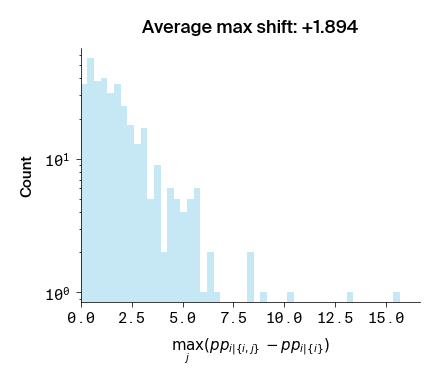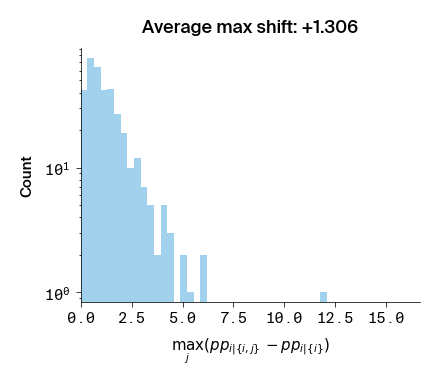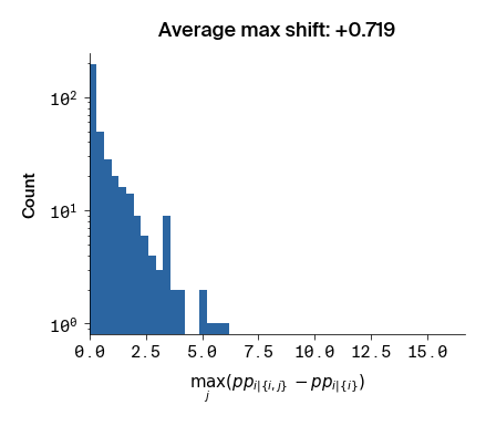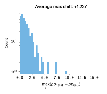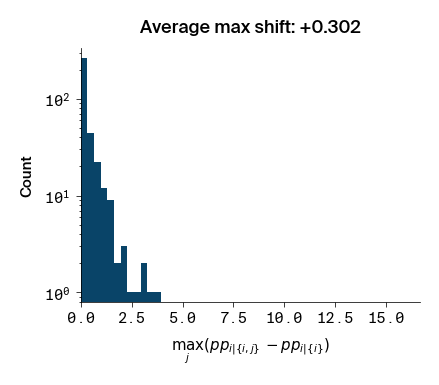 Figure 3: Histograms of the max difference in perplexity between \(p(i | \lbrace i, j \rbrace)\) and \(p(i | \lbrace i \rbrace)\). Compared to Figure 2, only the position \(j\) that causes the largest \(p(i | \lbrace i, j \rbrace)\) for a given \(i\) is included.