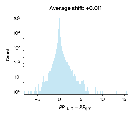 import matplotlib.pyplot as pltimport numpy as npx_min =float("inf")x_max =float("-inf")for model in ModelName: df = pairwise_data[model] diff = df["perplex_i_ij"] - df["perplex_i_i"] x_min =min(x_min, diff.min()) x_max =max(x_max, diff.max())for model, color inzip(ModelName, blue_palette_6.colors, strict=True): fig, ax = plt.subplots(figsize=(6, 5.25)) df = pairwise_data[model] diff = df["perplex_i_ij"] - df["perplex_i_i"] ax.hist(diff, bins=100, edgecolor="black", color=color) ax.set_title(f"Average shift: +{diff.mean():.3f}") ax.set_xlabel(r"$ PP_{i|\lbrace i, j \rbrace} - PP_{i|\lbrace i \rbrace} $") ax.set_yscale("log") ax.set_ylabel("Count") ax.set_xlim(x_min, x_max) plt.tight_layout() plt.show()