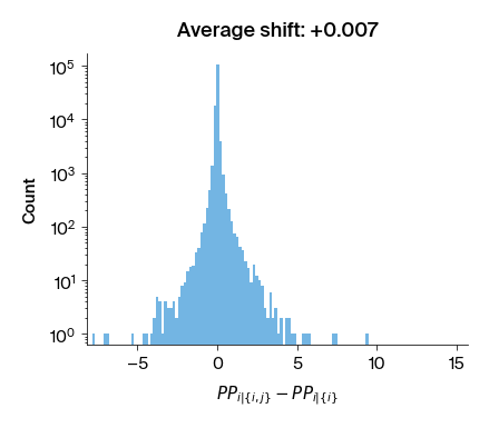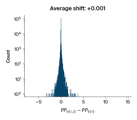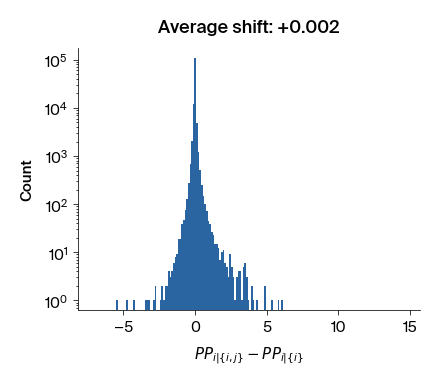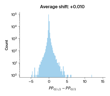 Figure 2: Histograms of the difference in perplexity between \(p(i | \lbrace i, j \rbrace)\) and \(p(i | \lbrace i \rbrace)\) for all residue pairs.