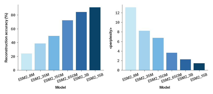 Figure 1: Single-masked token reconstruction accuracy and confidence for all ESM2 model sizes. (left) Percentage of positions that when masked, the model predicts the masked amino acid as most likely. (right) The perplexity of \(p(i \vert \lbrace i \rbrace)\) averaged over sites.